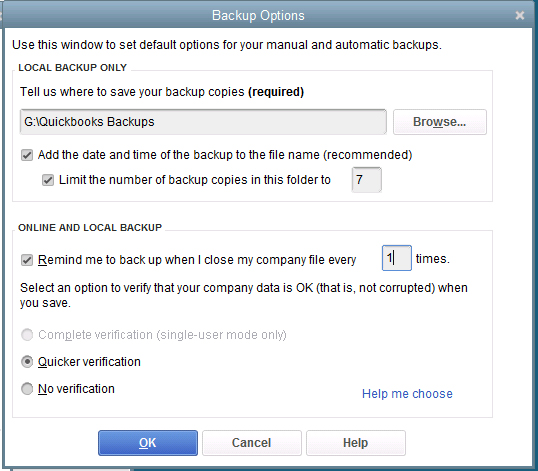 If something does happen to your QuickBooks file or computer, these backup files will be the key to restoring them to a working state, bringing your company up and running in almost no time at all. Configure these options under File, Back Up Company, Create Local Backup.